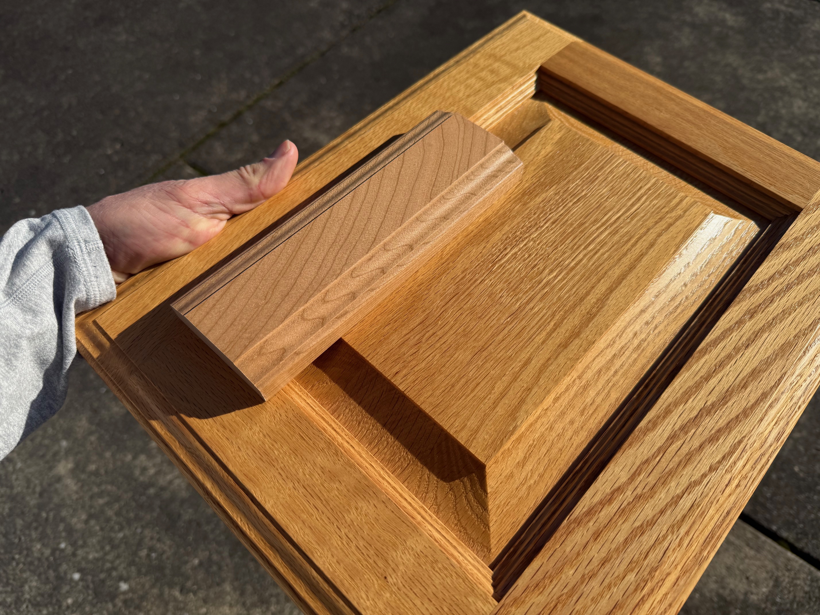 Sure, please see the attached photos. These show a red oak door with a clearcoat finish, with a clearcoat cherry wood sample placed on top. The cherry sample is brand new and has not yet fully aged. I will include a pic showing how it ages as well. Cherry changes a lot over time.