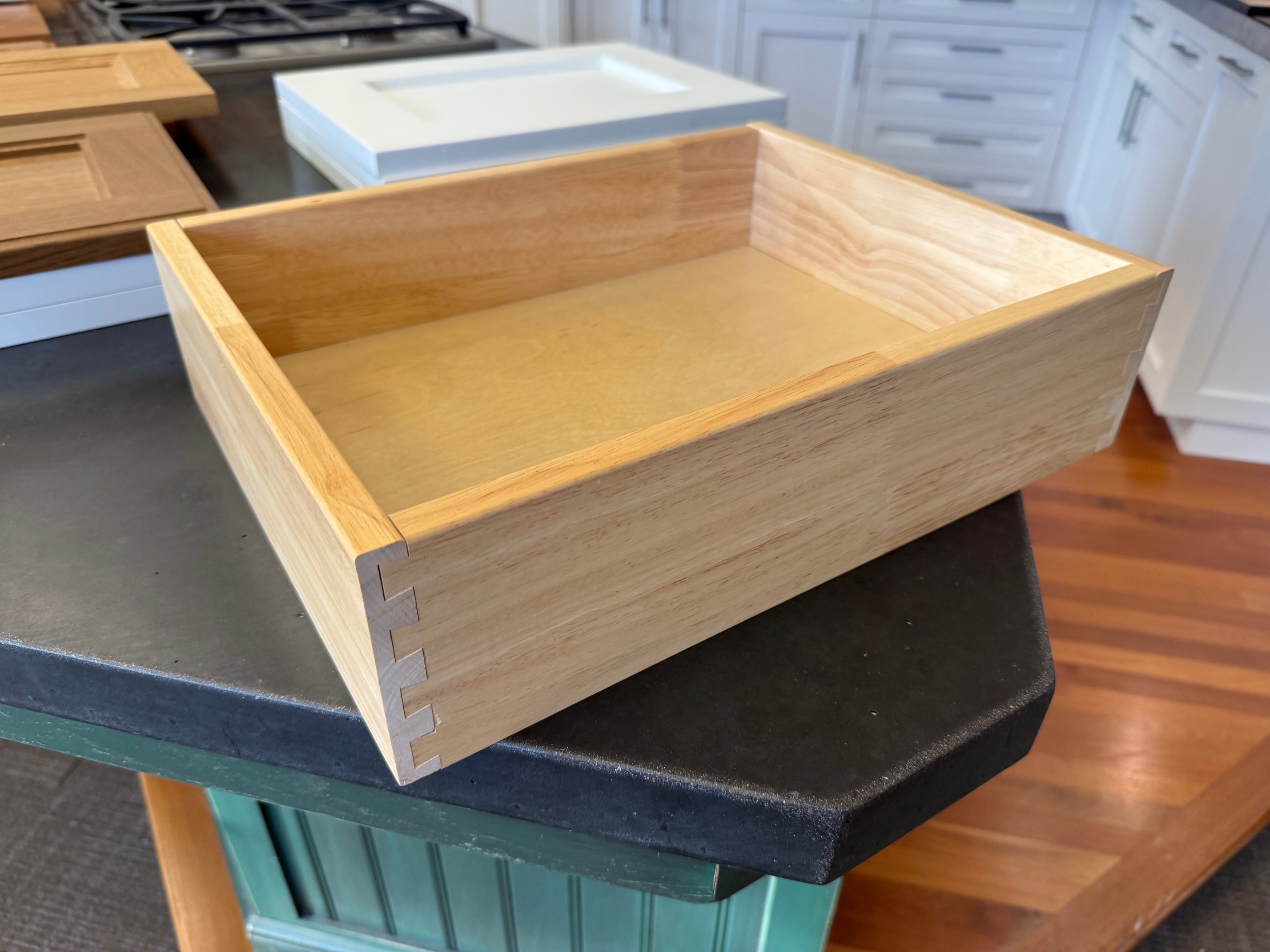 Personally, I prefer one pullout at the bottom with adjustable shelves above, as shelves typically provide the most efficient and versatile storage. All pullout shelves are built using dovetailed rubberwood drawer boxes mounted on soft-close Blum slides, identical to the drawer construction used in our standard base cabinets.